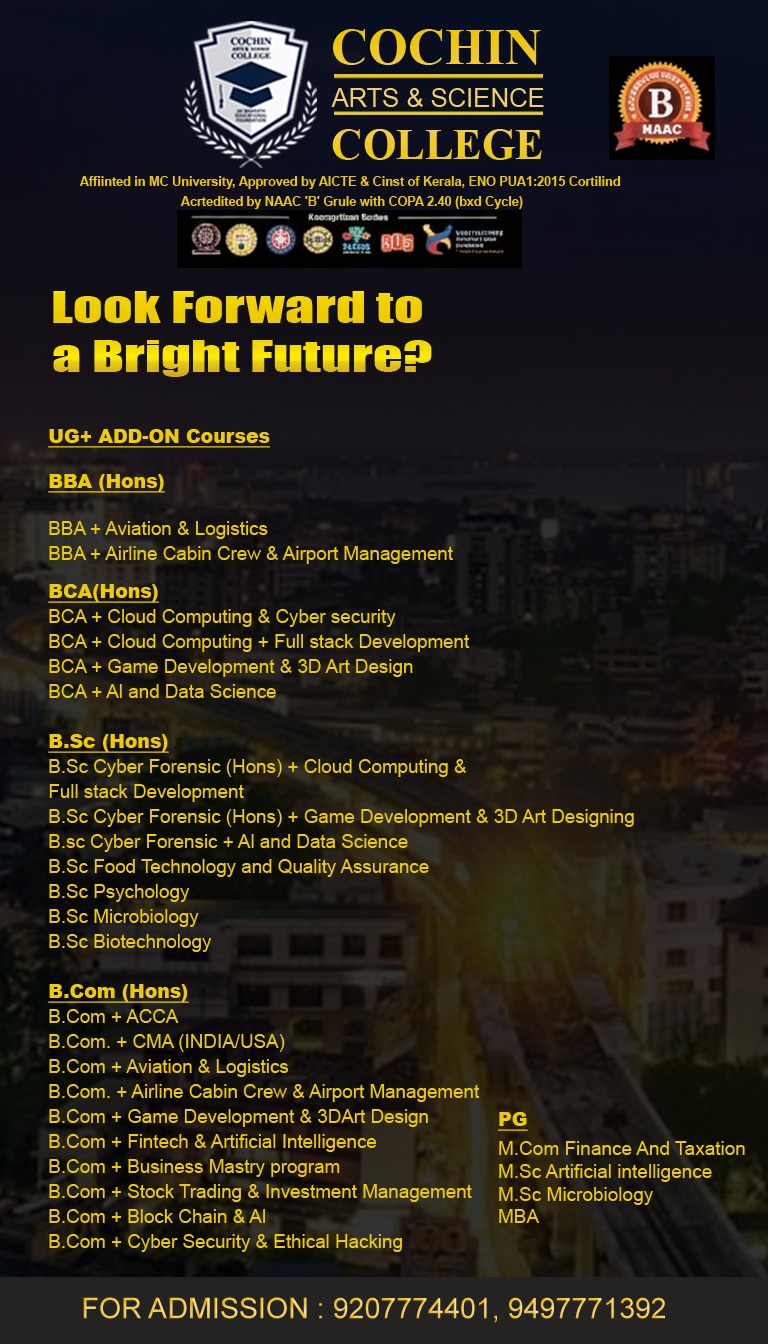 Cochin Arts and Science College strives to create future society where ignorance, inequality, illhealth, illeteracy, poverty and powerlessness can be eradicated and equitable development takes place through achieving & equal access to education to all the members in the society.